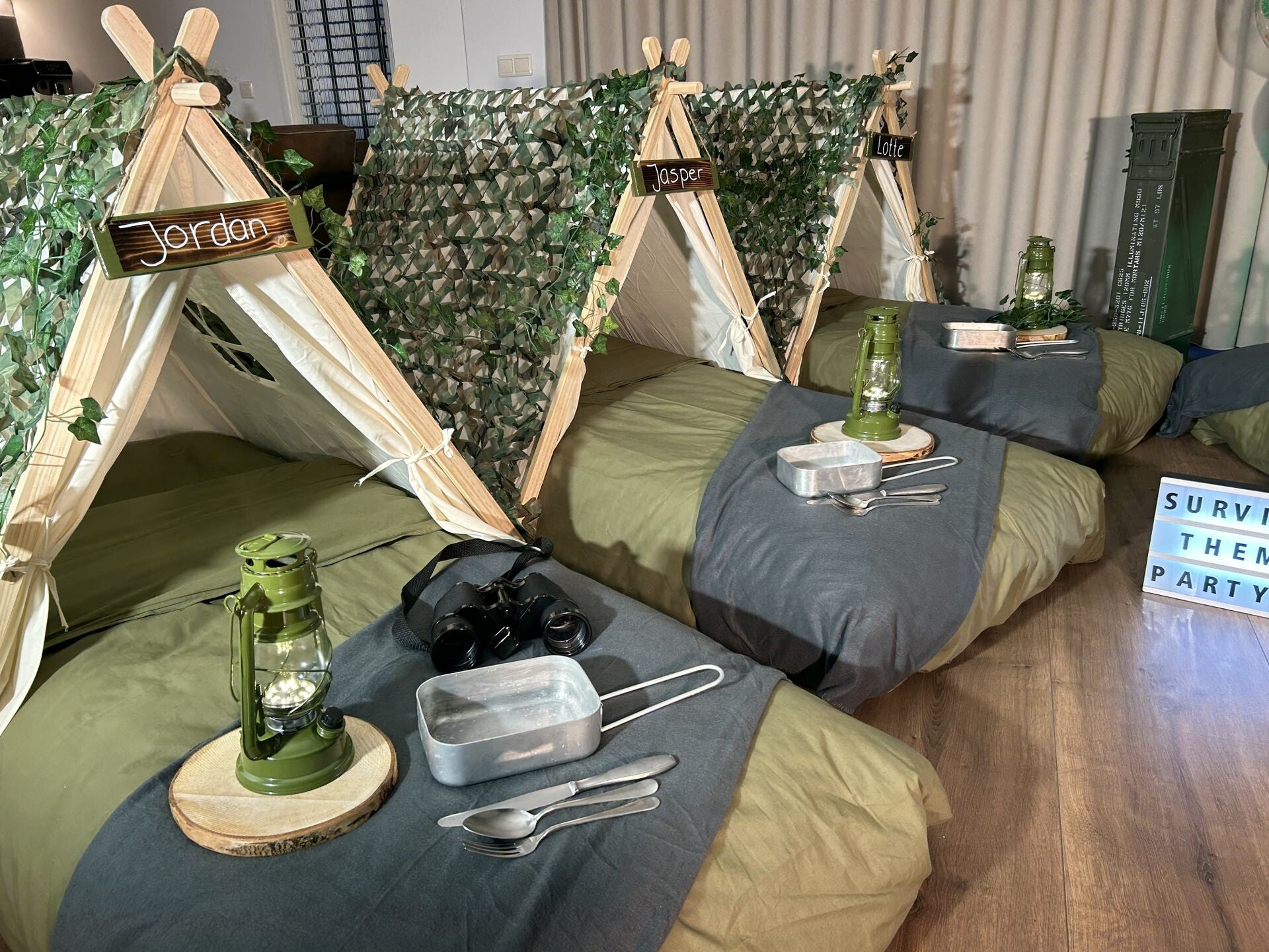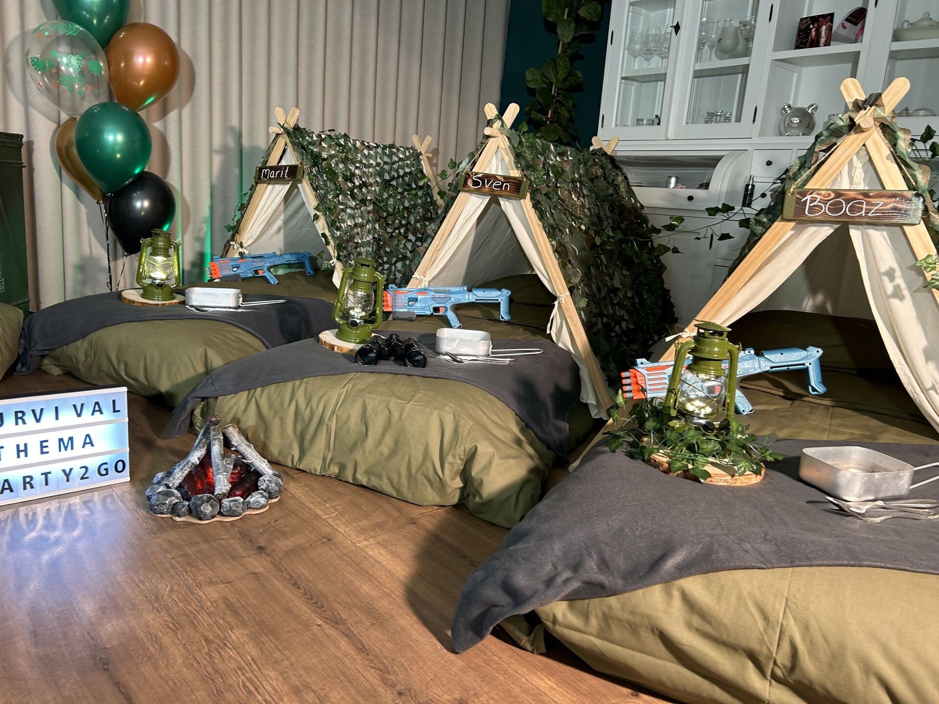 Dit stoere survival thema wordt geleverd met vele leuke decoraties zoals: