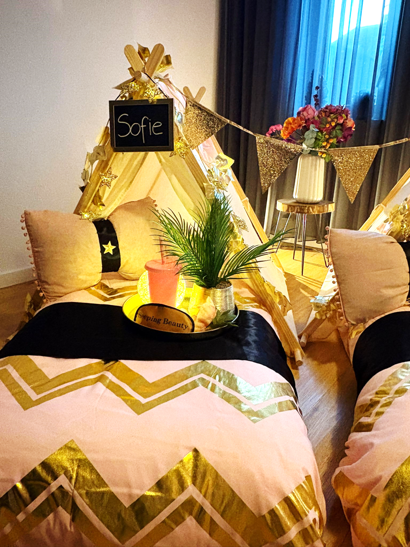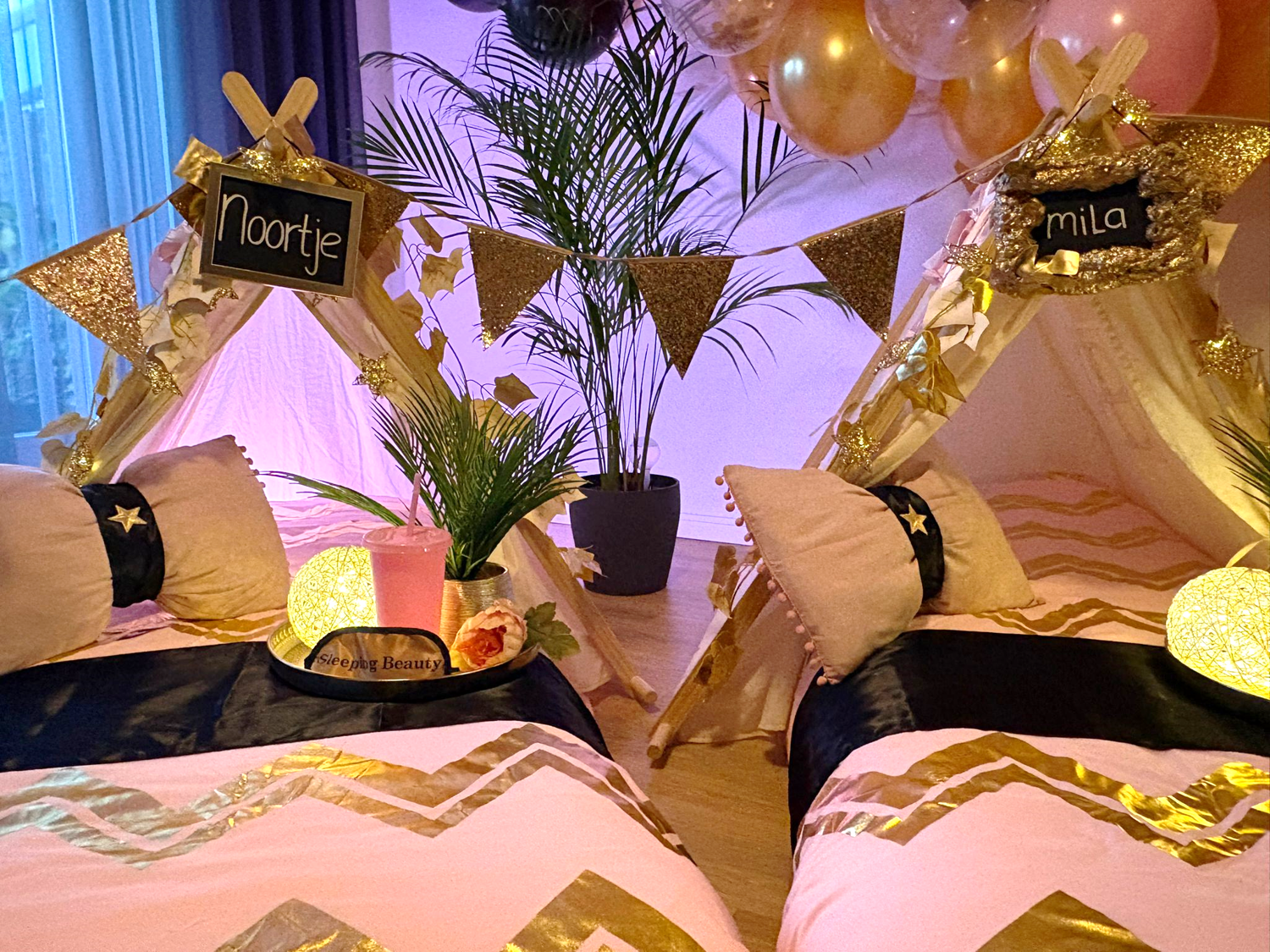 Dit thema is voor de echte glamour diva’s! Een luxe slaapfeestje vol goud en roze, zachte stoffen en stijlvolle details. Perfect voor een onvergetelijke avond met je vriend(inn)en!